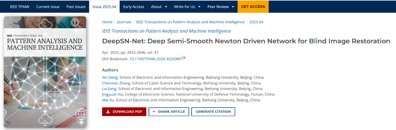 近日,北京航空航天大学电子信息工程学院徐迈教授、邓欣副教授,联合国防科技大学夏靖远副教授,提出了一种基于半光滑牛顿算法的二阶深度展开网络,显著提升了盲图像复原精度和鲁棒性。该研究填补了二阶深度展开网络的研究空白,为基于深度展开的可解释图像智能处理提供了新思路。研究成果以“DeepSN-Net: Deep Semi-Smooth Newton DrivenNetwork for Blind Image Restoration”为题发表于IEEE Transactions on Pattern Analysis and Machine Intelligence期刊。该工作得到了国家自然科学基金(项目编号:62372024和62231002)资助。