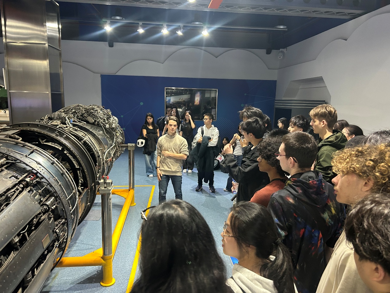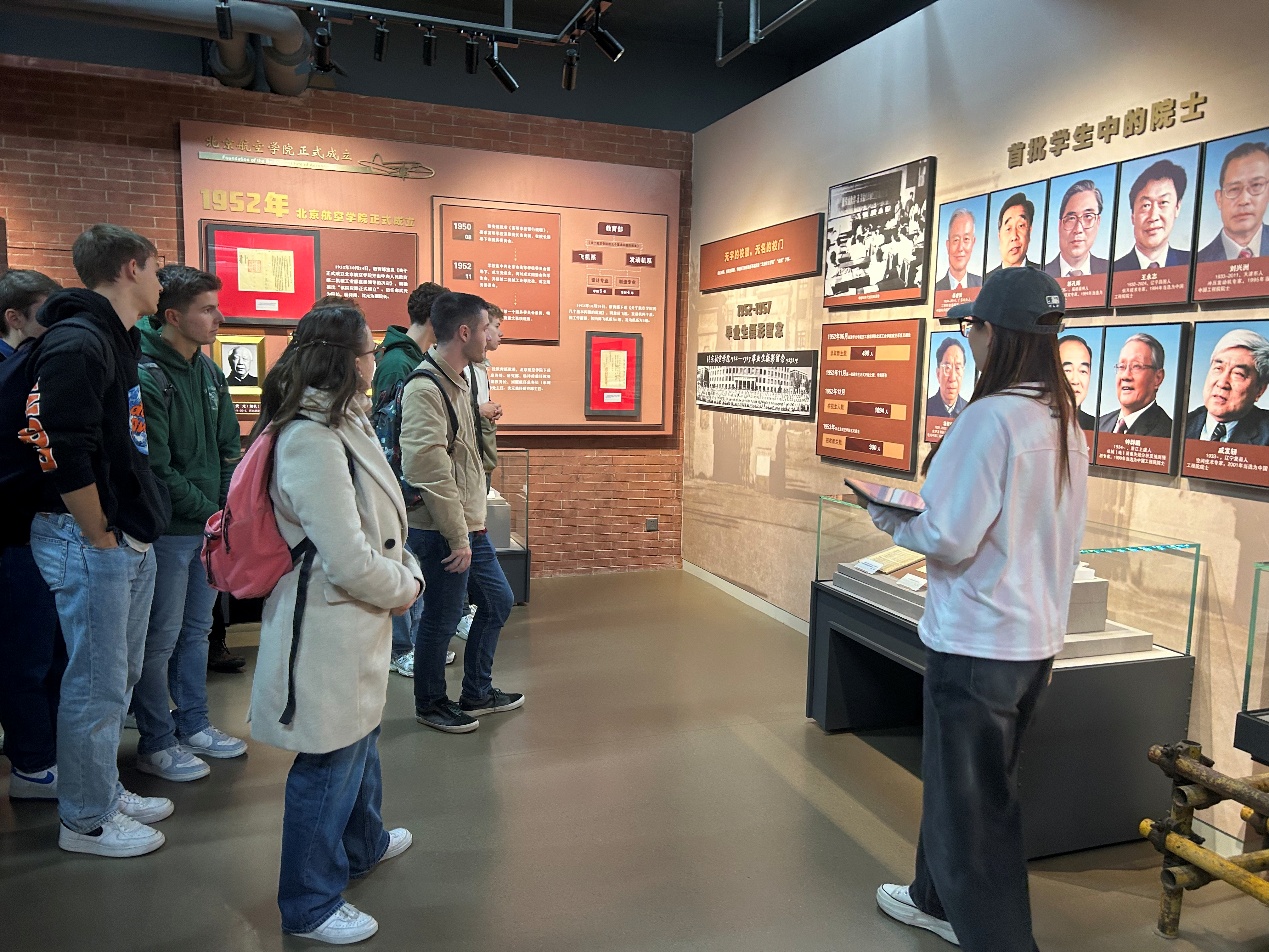 下午,师生团队先后走进航空航天博物馆与校史馆。在航空航天博物馆,法国留学生讲解员以“长空逐梦”“银鹰巡空”等展区为核心,结合实物展品讲解人类航空航天发展历程,让来访师生直观感受中国航空航天事业的蓬勃活力;在校史馆,讲解员通过历史图片、实物展品,生动讲述北航建校初心与辉煌成就,师生们不时驻足提问,深入了解北航与中国航空工业的紧密联系。