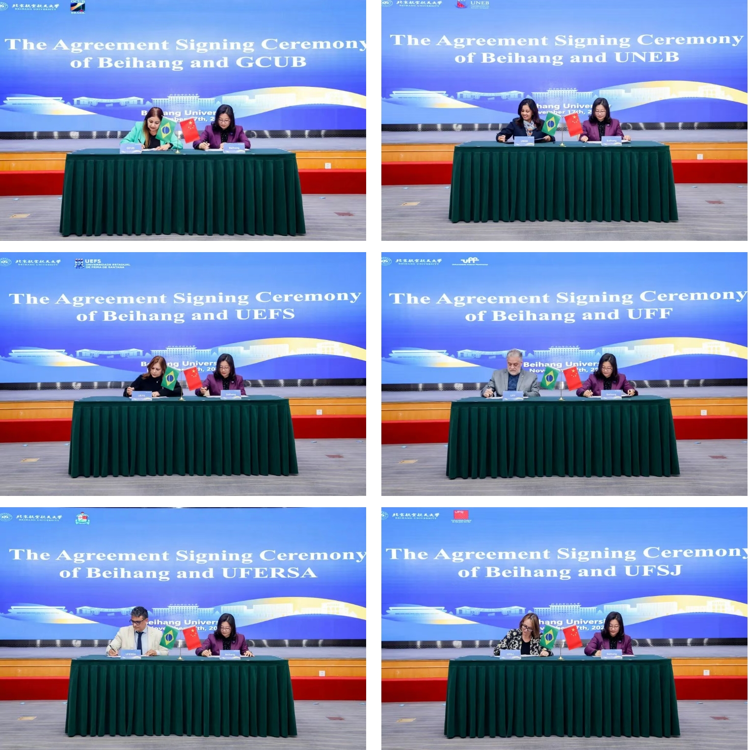 会上,北航副校长邓怡代表北京航空航天大学,分别与巴西大学国际合作集团、巴伊亚州立大学、费拉迪圣安娜州立大学、弗鲁米嫩塞联邦大学、塞米阿利杜联邦大学与圣若昂德雷联邦大学签署谅解备忘录。根据协议,北航将与巴西大学国际合作集团及5所大学开展支持师生互访、推动联合科研、学术交流与资源共享等方面的切实合作。