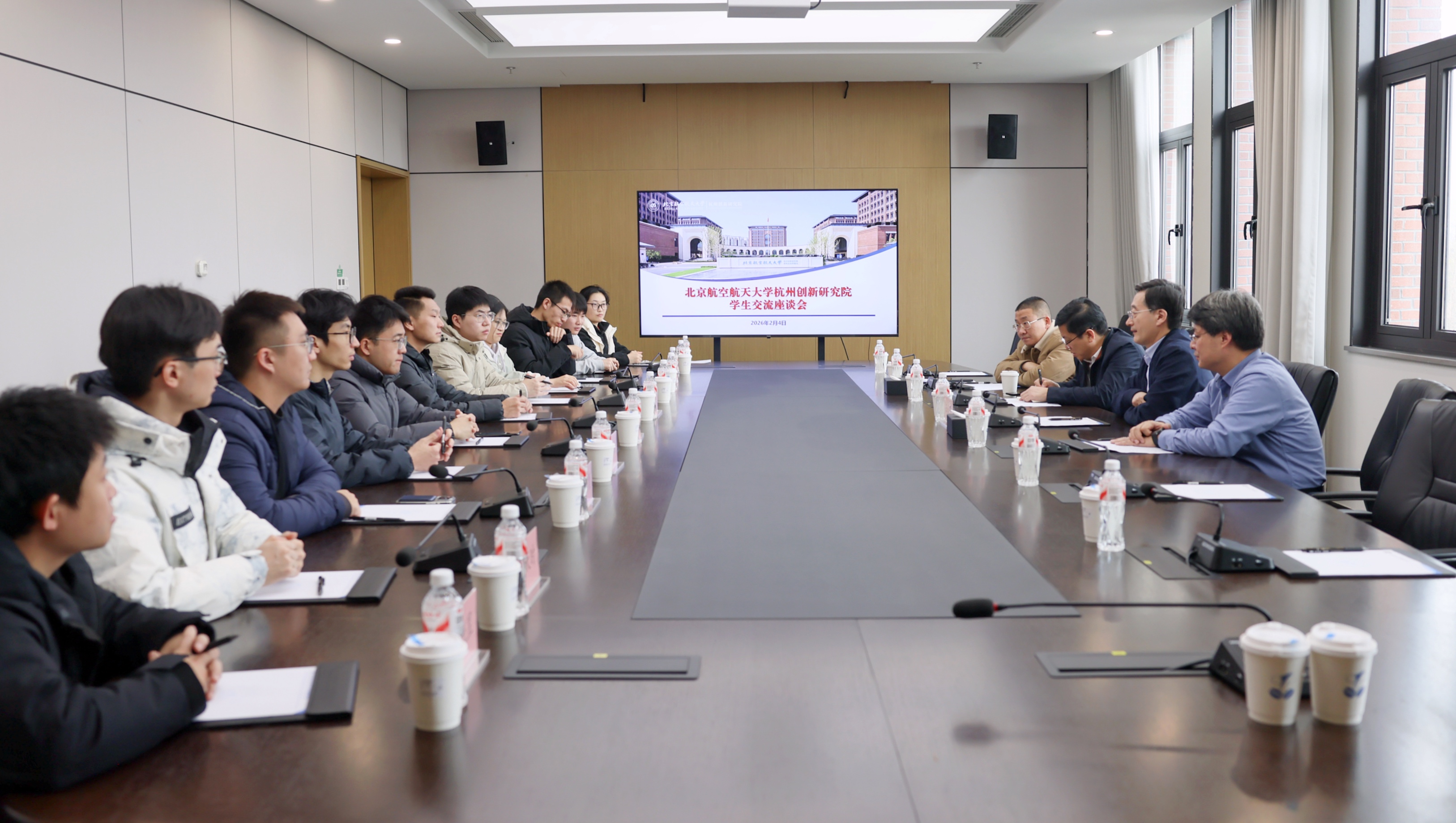 在杭州创新研究院,王云鹏与硕博学生代表围绕学业规划、职业发展、校园生活等座谈交流。同学们分享了各自的学科背景、研究方向与科研进展,表达了对在杭校园生活的珍惜与热爱,同时对学校良好的校园环境、雄厚的师资力量和优越的科研条件予以高度认可。